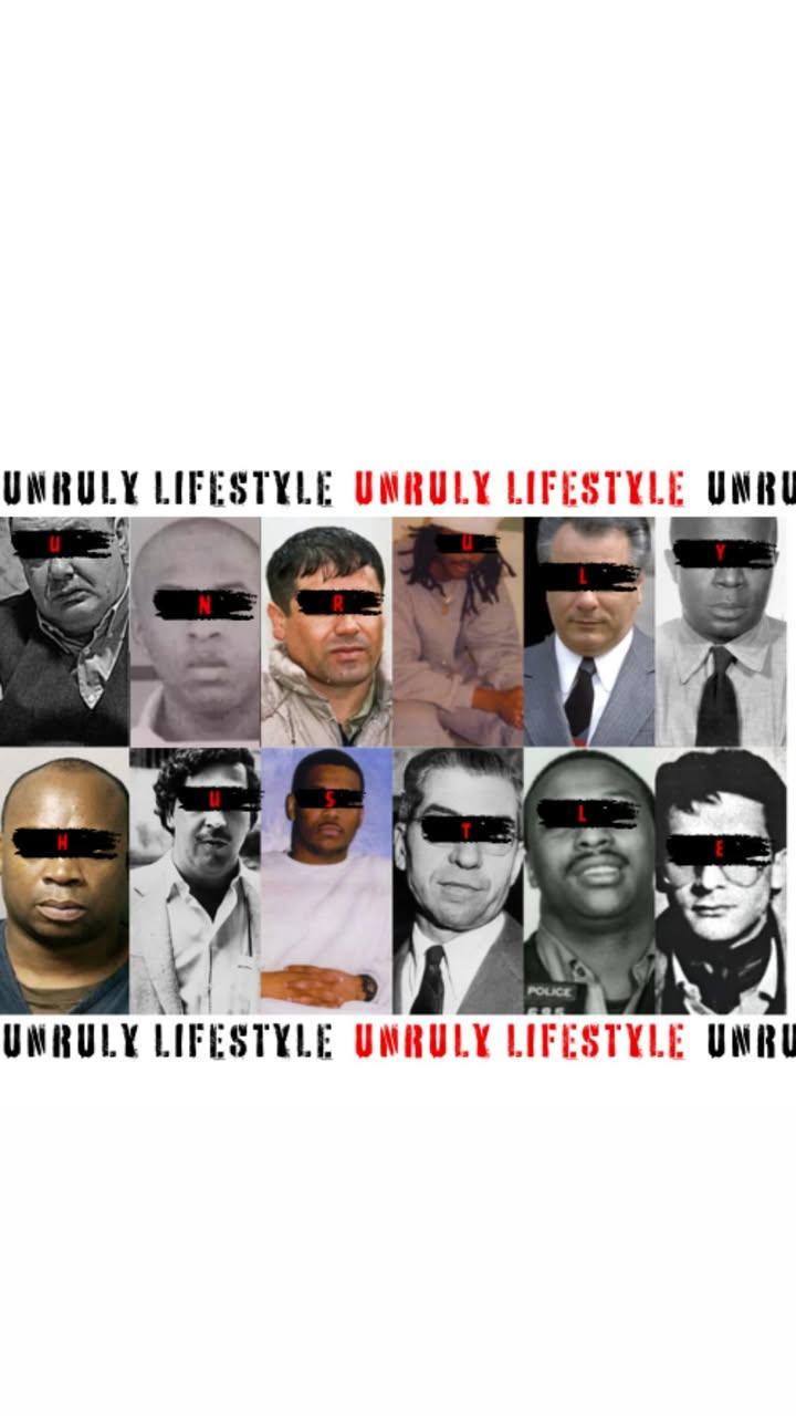 The front graphic shows the faces of legends, hustlers, outlaws, and icons—each censored, each carrying the letters that form UNRULY. It’s a reminder that every path has a story, and every story comes with struggle.